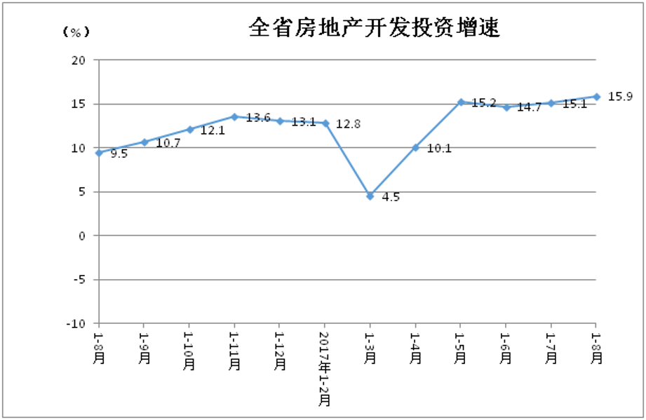 1-8月,全省房地产开发完成投资2031.56亿元,同比增长15.9%,比1-7月提高0.8个百分点。其中,住宅完成投资1248.96亿元,增长11.4%;办公楼完成投资106.51亿元,增长0.6%;商业营业用房完成投资387.97亿元,增长16.7%。